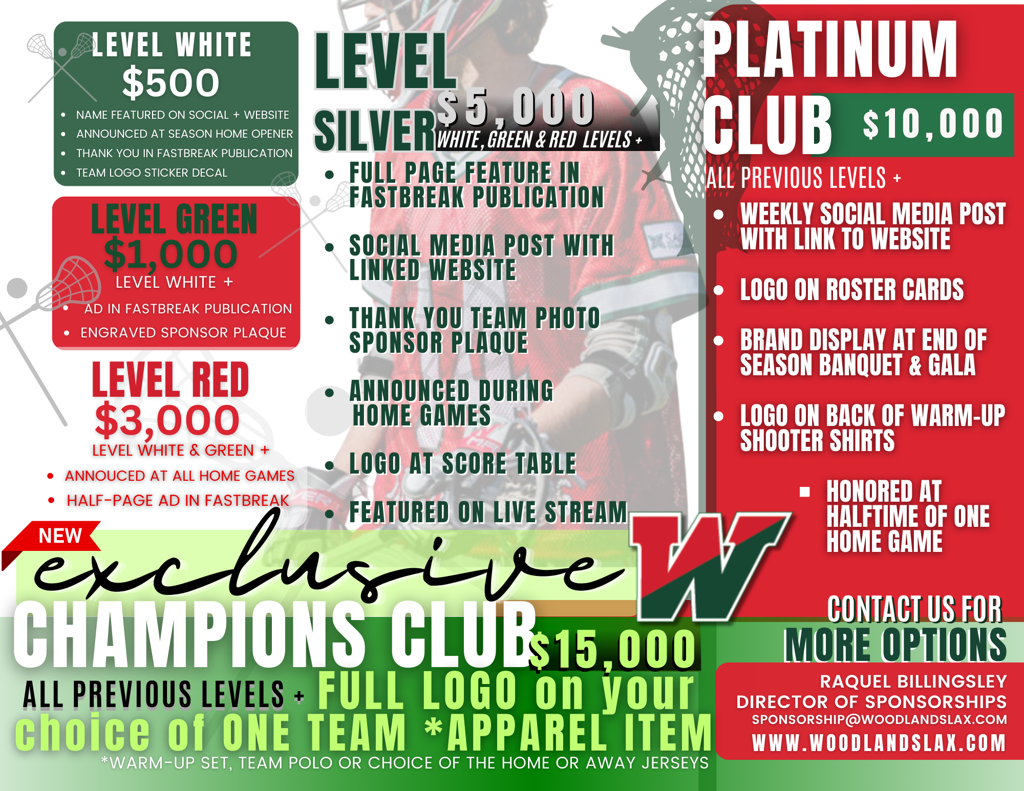 The Woodlands Lacrosse Club is a sports club that relies on registration fees, donations, and community sponsorships for funding. The club incurs various expenses, including but not limited to renting practice and game fields, hiring referees, paying for travel, and purchasing equipment like scoreboards and goals.